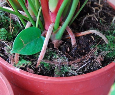 Перед пересадкой аккуратно достаньте каладиум из старого горшка, обрежьте все подсохшие клубни. В горшок выложите дренаж, песок и субстрат (смесь глинистой, листовой и дерновой земли). После высаживания почву немного увлажните.