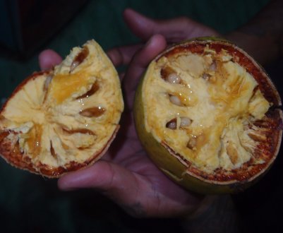Плотная чешуйчатая оболочка зрелого плода имеет темно-зелёный, жёлтый, коричневый или даже красноватый оттенок. Внутри плода – яркая желтая мякоть. Она обладает приятным вкусом и хорошим ароматом. Созревшие плоды ананаса достигают веса 4-5 кг.