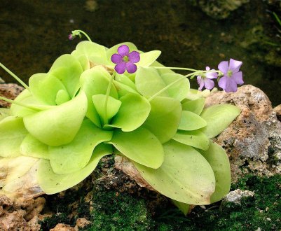 Это самое известное растение-хищник, которое широко культивируют в домашних условиях. Питается паукообразными, мухами и прочими мелкими насекомыми. Растение тоже небольшое, из короткого стебля после цветения растения вырастет по 4-7 листьев. Цветет небольшими белыми цветками, собранными в кисть.