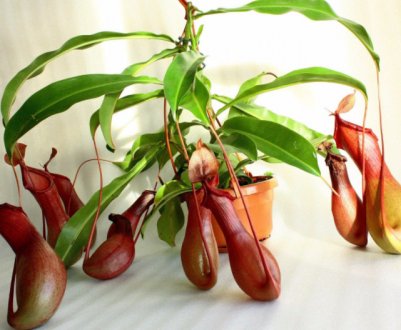 Тропическое растение, которое питается насекомыми. Растет в виде лианы, вырастая до 15 метров в длину. На лиане образуются листья, на концах которых отрастает по одному усику. В конце усика со временем формируется цветок в форме кувшина, который и используется в качестве ловушки. К слову, в этой природной чаше собирается вода, которую в природной среде обитания пьют обезьяны. За это оно получило еще одно название – «обезьянья чашка».