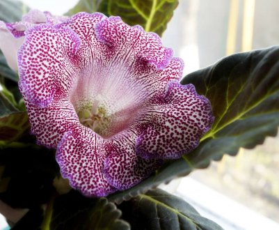 Впечатляет мраморным рисунком на крупных бутонах. Глоксинии этого сорта свойственны махровые бархатные цветы белого окраса с сиреневым и фиолетовым крапом. Характерно, что его насыщенность густеет, образуя темную чашечку. При благоприятных условиях на лепестках возможен алый отлив. По краям розоподобные цветочки белые или едва лиловые. Листья удлиненные, темно-зеленого цвета с яркими серебряными прожилками.