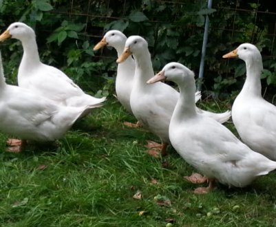 Практически целые дни летом утки проводят на выпасе, где лакомятся не только травой, но и всевозможными насекомыми, червями, слизнями, улитками и т. п. В летнее время достаточно кормить уток два раза в день, при этом сухие зерновые должны быть доступны в кормушке постоянно.