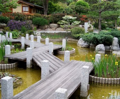 Сюда захочется приходить, когда есть острая потребность отдохнуть, уединиться с природой, заняться медитацией. Берег водного объекта желательно украсить специальными водными культурами и цветами. В качестве дополнительных элементов декора можно использовать каменные вазы или статуи.