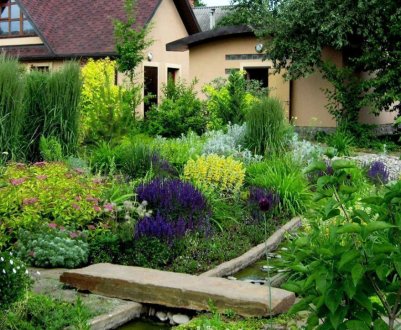 Что касается выбора цветов, то тут первенство занимают ирисы: без них модерн в ландшафте не будет обладать присущей ему изящностью. Подбирать нужно самую разнообразную цветовую гамму: от ярких вызывающих окрасов до нежных пастельных оттенков. Клумбы с ирисами целесообразно дополнить флоксами, нарциссами, лавандой, карликовыми хризантемами, лилиями, лилейниками, чернобривцами.