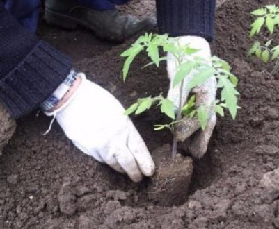 Прежде чем высадить рассаду томатов в открытый грунт, нужно подготовить почву. Для этого за неделю до высадки можно внести горячий раствор медного купороса на участок, как обработку от вредителей. И только тогда удобрять почву минеральными и органическими удобрениями. На один квадратный метр вносится по 10 кг перегноя, полведра древесной золы и 50-70 г суперфосфата. Тогда участок перекапывают. Высаживать рассаду нужно, когда саженцы достигли хотя бы 25 см в высоту и их корневая система достаточно развилась. Сажаются томаты в отдельные лунки, в которые перед тем налито немного воды. Рекомендуемая схема посадки помидоров – 50 х 40 см.